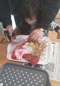 稲穂、裏白、水引、ドライフラワー、リボン、可愛いお飾りパーツなど…たくさんの材料をご用意し、皆様に自由にデザインしていただきました🌸